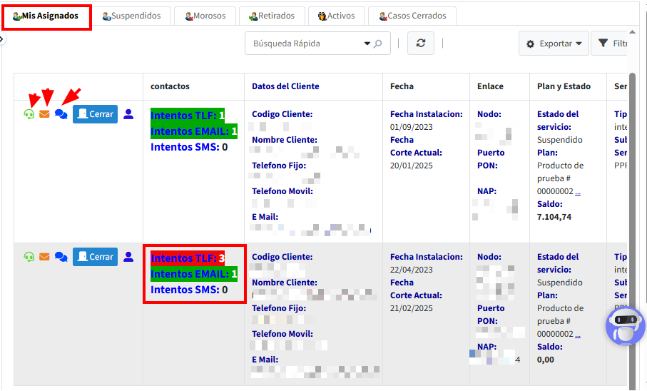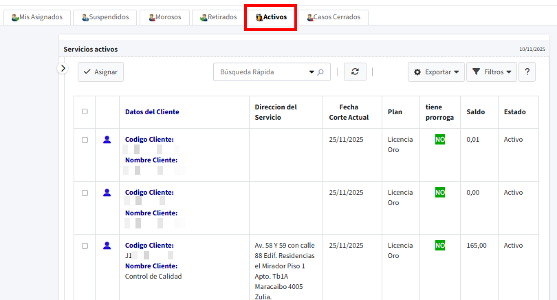 El operador navega a través de las listas de clientes y se los asigna para gestionar la recuperación de clientes retirados, investigar las razones por las que están morosos o suspendidos, y ofrecer promociones a los clientes activos. Visualiza si cuentan con prórrogas, su dirección de servicio, el plan contratado y la fecha de corte actual.