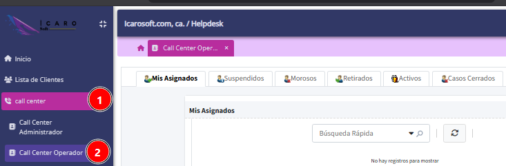 El menú principal muestra las secciones correspondientes según el rol. Los usuarios acceden a listas de casos con filtros por estado para facilitar la búsqueda y seguimiento. Al ingresar al sistema, se ubica el menú en la parte izquierda de la pantalla, se hace clic en el apartado de Call Center, luego se despliegan “Call Center Administrador” y “Call Center Operador”.