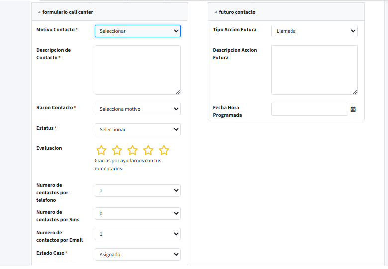 Además, se dispone de un formulario adicional destinado a recopilar información importante para un posible futuro contacto con el cliente. Para finalizar el proceso, el operador cambia el estado del caso a cerrado y guarda el formulario.