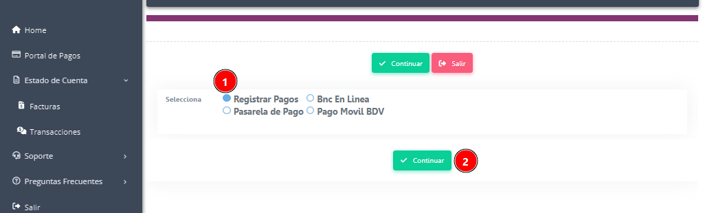 Luego Seleccionamos Registrar pagos y después en continuar.