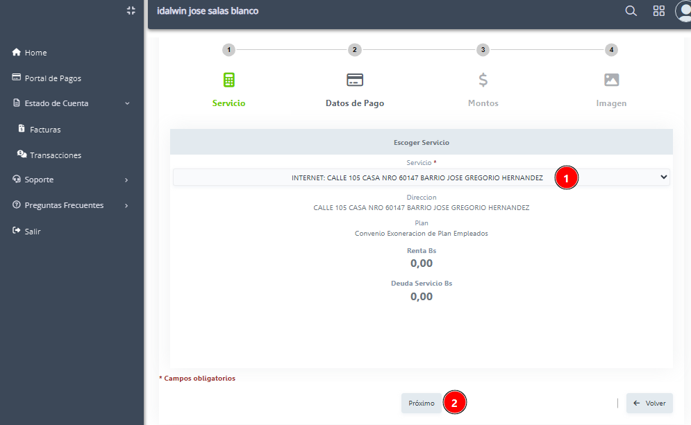 Acto seguido seleccionamos el servicio a cancelar, seguidamente clicamos en próximo.