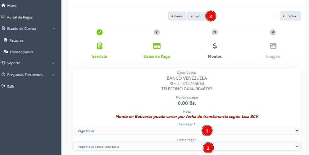 De las opciones en Tipo de Pago, seleccionamos Pago Transferencia Bolívares, en Forma de Pago, seleccionamos Transferencia Banco de Venezuela, nos mostrará los datos de la cuenta, y el monto a pagar, de igual forma pasará lo mismo con cualquier otro medio de pago. Luego cliqueamos en próximo.