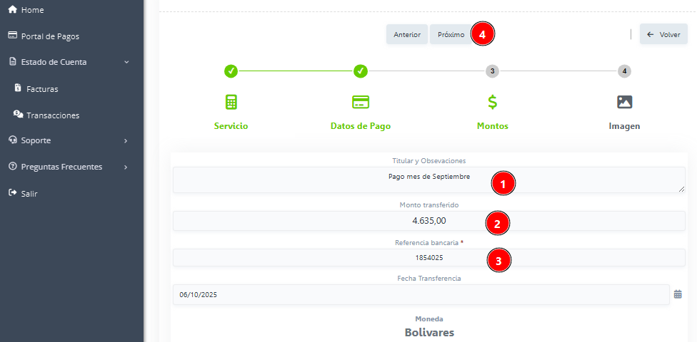 En Titular y Observaciones agregamos una descripción, tipiamos la Referencia bancaria, colocamos el monto transferido y después damos en Próximo.