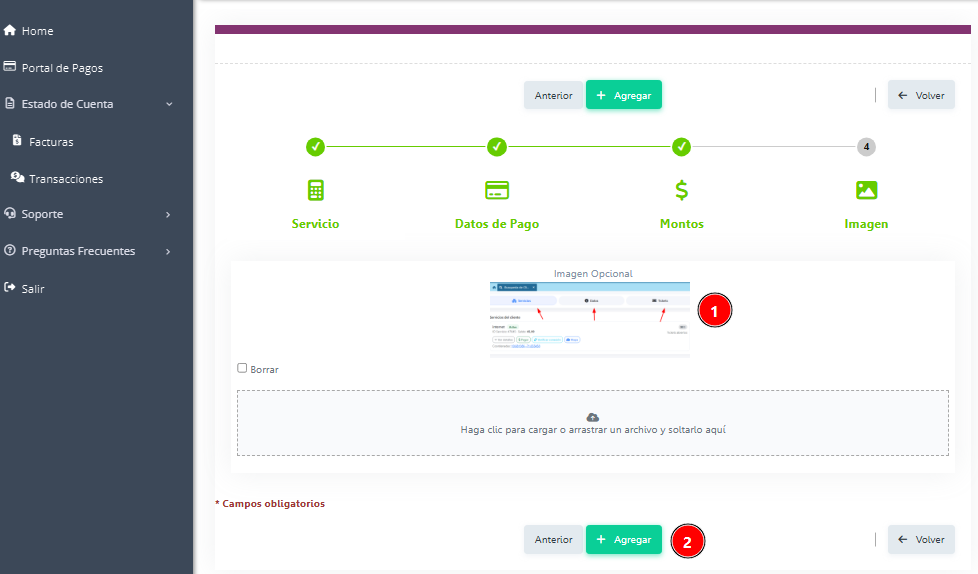 En este paso clicamos el icono de la nube o arrastramos y soltamos el archivo en ese campo, de haber hecho clic nos mostrará una ventana de nuestra pc, donde buscaremos la imagen del pago realizado, seleccionamos el capture y después en abrir, automáticamente se nos mostrará la imagen cargada y presionamos en agregar.
