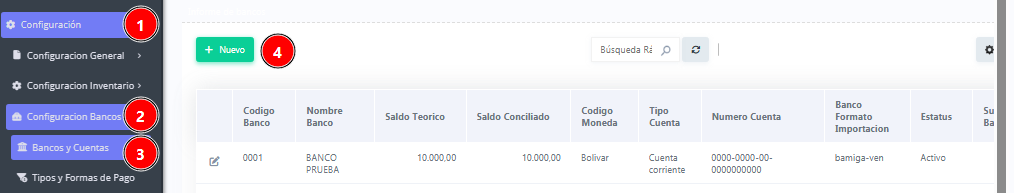 Tras haber ingresado al sistema buscaremos en nuestro menú el módulo de Configuarcion en el cual seleccionaremos el apartado de Configuarcion de Bancos y luego Bancos y cuentas, donde después haremos clic en +Nuevo.
