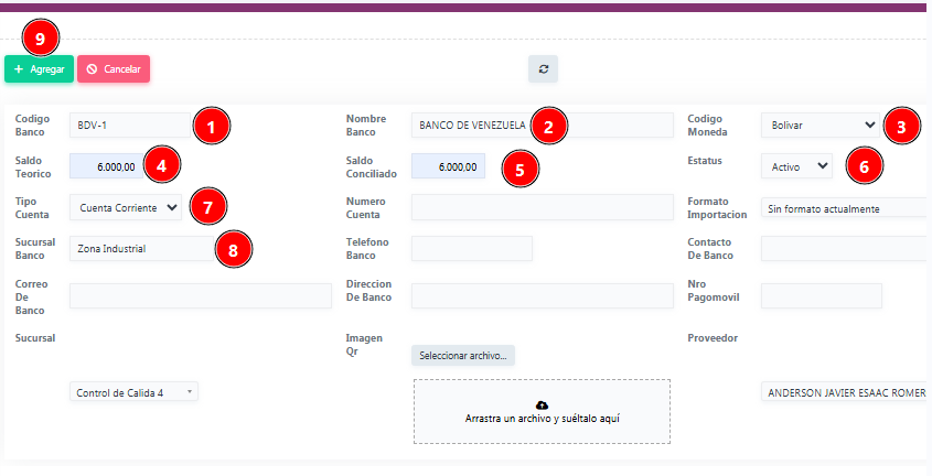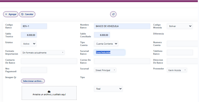 Empezamos a registrar la información del mismo, como código del banco, nombre del banco, elegir el código de moneda, seleccionar el tipo de cuenta, asignar un número de cuenta, configurar el formato de importación que nos servirá para la conciliación bancaria, sin olvidar mencionar que si posees información como la sucursal, teléfonos, contactos y dirección del banco puedes agregarla sin ningún problema.