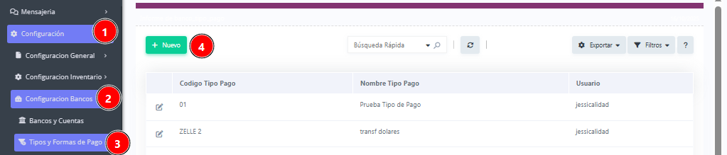 Acto seguido nos dirigimos al apartado de la configuración de nuestro menú Buscando el módulo de tipos y formas de pago donde haremos clic en el botón de nuevo.