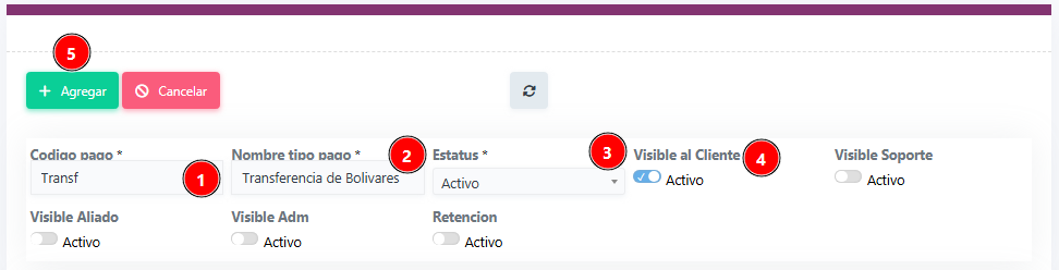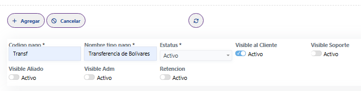 Ahora registraremos el código de pago como transferencia, en nombre tipo de pago escribimos transferencia bolívares, en status seleccionamos la opción de activo, agregamos también la visibilidad del pago tanto para clientes, como podría ser para aliados y soporte. Luego hacemos clic en el botón de agregar y después en el botón de Nuevo.