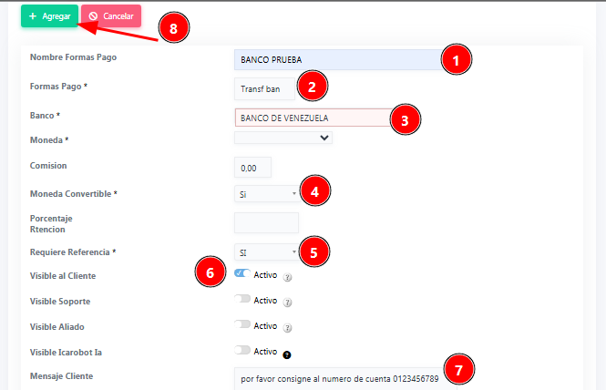Nos aparecerá el recuadro y registrar el código de forma de pago, la forma de pago, seleccionar el banco, seleccionamos si la moneda es convertible o no; para este caso sí ya que se tratan de bolívares, si requiere referencia marcamos que sí y si será visible al cliente, soporte o aliado éstos datos del banco en los portales. luego presionamos el botón de agregar para concluir con el proceso.