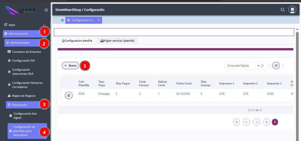 Ingresando a la aplicación ubicamos el módulo de configuración y luego configuración de plantillas. Después presionaremos el botón de Nuevo.