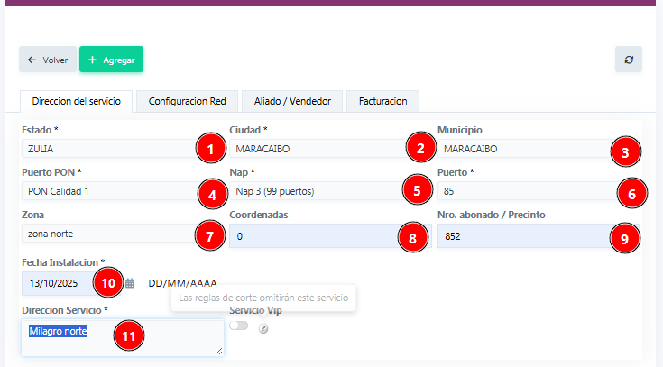 - Dirección del Servicio: se colocará la dirección especifica donde se va a instalar el servicio.