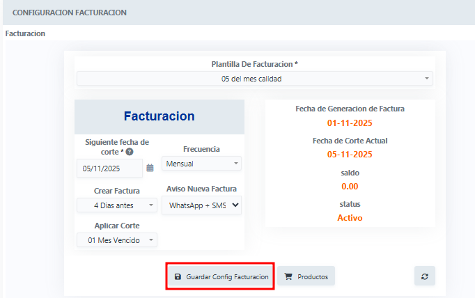 De esta manera veras la parte de Facturación, con los siguientes datos, la cual deben salir todos ya registrados porque los creamos anticipadamente en configuración de plantillas de facturación, y damos clic en guardar configuración facturación, y al botón Regresar.