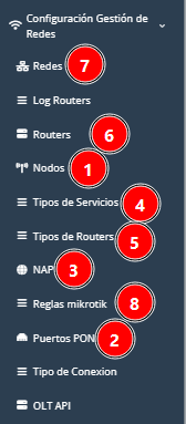 Es importante configurar todo desde “Gestión de redes” antes de agregar clientes, incluyendo routers, nodos, NAP, puertos PON, reglas del Mikrotik, entre otros.