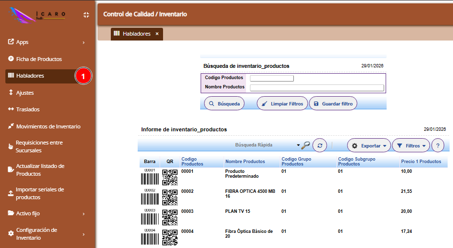 Al Ingresar a nuestra aplicación nos dirigimos al menú donde haremos clic en el Modulo inventario y luego el panel de habladores, el cual nos desplegará una pantalla en la que apreciaremos un recuadro de búsquedas bien sea por código de productos o nombres de productos. Notaremos también que automáticamente se reflejará una lista con todos los productos que tengamos creados en nuestro sistema.