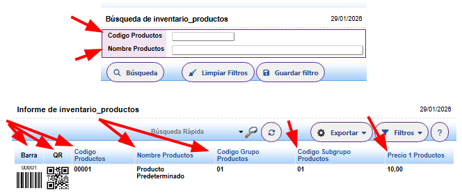 Resaltamos, que es de mucha utilidad cuando disponemos de bastantes productos la herramienta de búsqueda por código, si lo sabemos, o mejor aún por nombre de productos, ya que específicamente accedemos al mismo validando los detalles que lo conforman principalmente su código de barras y QR, seguido de demás códigos y precio.