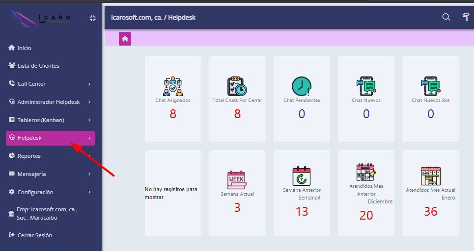Tras acceder al portal apreciaremos el Dashboard principal que nos indica, cuantos Chat Asignados, Total Chats Por Cerrar, Chat Pendientes o Chat Nuevos tenemos y otros datos Adicionales como cuantos atendimos en la semana Actual, en el mes Anterior y mes Actual, también veremos el menú, donde empezaremos haciendo clic en el módulo Helpdesk.