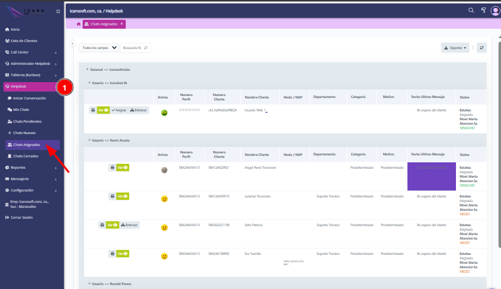 Entraremos a Chats Asignados, y observamos a los usuarios que atienden los diferentes clientes, y si es necesario que un usuario participe en la conversación, es donde se lo asigna.