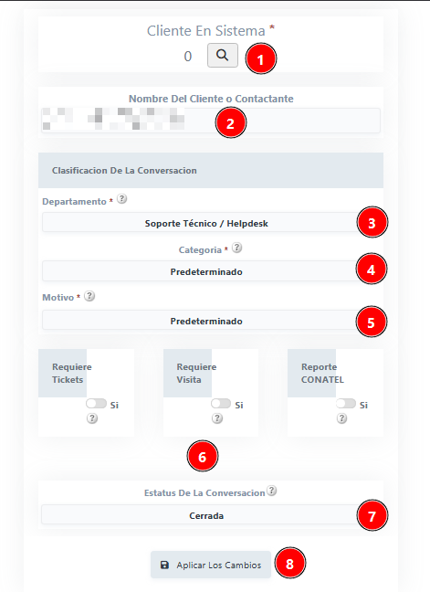 Donde empezaremos a llenar las casillas, Cliente en Sistema, Status, Departamento, ademas de marcar requerimientos, notaremos que como el status lo seleccionamos Cerrado, ya no aparece en nuestro chat.