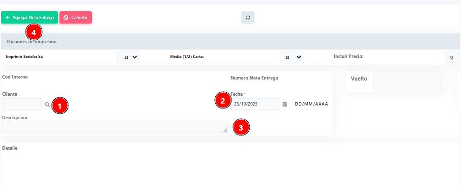 Después de hacer clic en crear nota nos aparecerá un nuevo entorno en el cual debemos de seleccionar el código interno del cliente o en su defecto buscarlo por la herramienta de la lupa, después verificamos la fecha ya que podríamos crear una nueva nota de entrega con fechas anteriores, actuales y futuras según sea el caso. Luego agregamos una descripción de la nota y después presionamos el botón (+ Crear Nueva Nota).