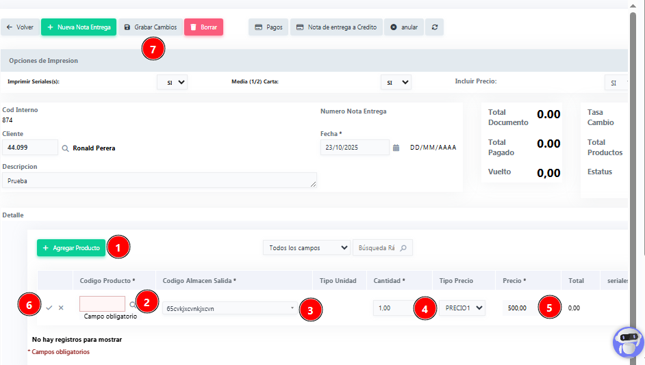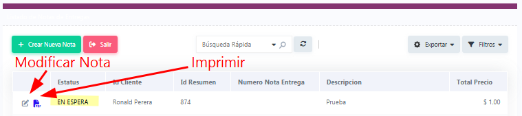 Después de guardar los cambios tendríamos lista nuestra nota de entrega activándose también las opciones para procesarla de inmediato como Pagos, Nota de entrega a Crédito o Anular. Haciendo clic en Volver, apreciaríamos nuestra nota en un estatus de espera con opción a imprimir o modificar de nuevo si fuese necesario. Puede quedar así para un posterior proceso.