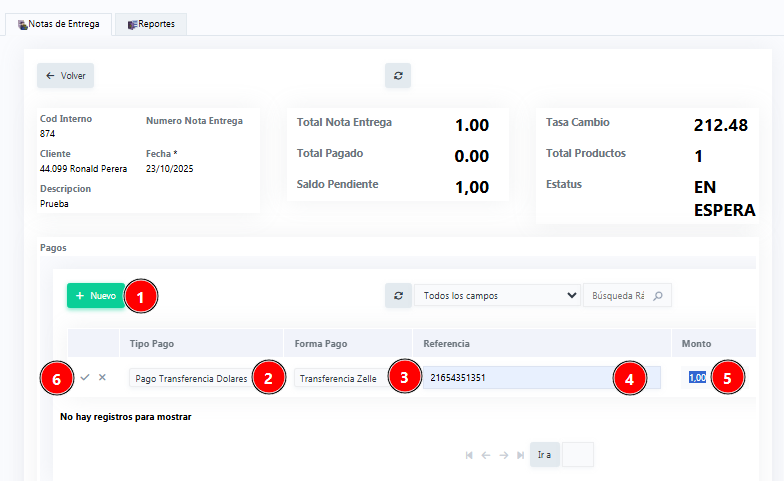 En este caso procesaremos nuestra nota de entrega mediante un Pago. Donde nos aparecerá una nueva pantalla en la cual debemos de presionar en nuevo, escoger el tipo de pago, la forma, escribir una referencia y agregar el monto bien sea en bolívares o dólares para después darle a confirmar.
