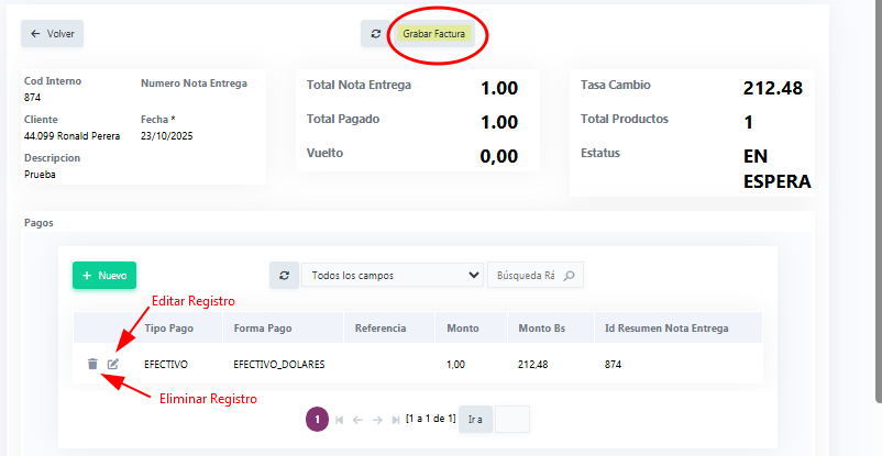 Confirmado el tipo de pago tendremos aún habilitadas las opciones de editar el registro o eliminarlo, pero al observar que todo está correcto procedemos hacer clic en el botón de Grabar Factura.