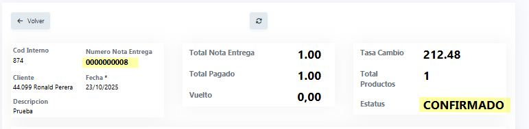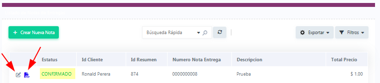 Haciendo clic en Volver, observaríamos una lista con la nota de entrega en un estatus confirmado, con su respectivo número de control y las opciones aún de modificar la misma y vista previa para impresión.