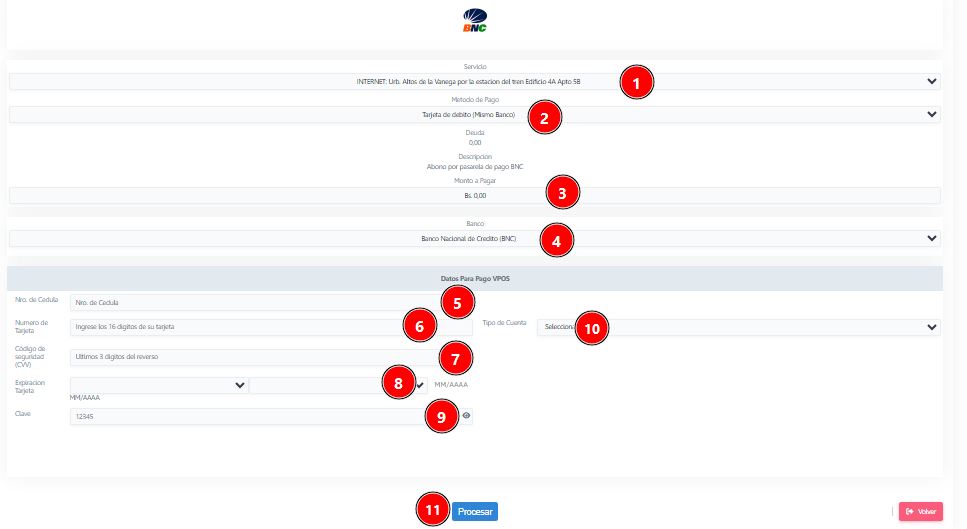 Elegimos el servicio a cancelar, colocaremos el método de pago, luego escribimos el monto a pagar, completando la información con número de cedula, número de tarjeta, seguidamente del tipo de cuenta, código de seguridad (CVV), Expiración Tarjeta, clave y luego Procesar.