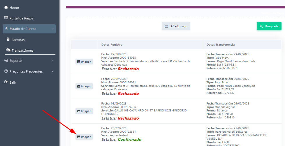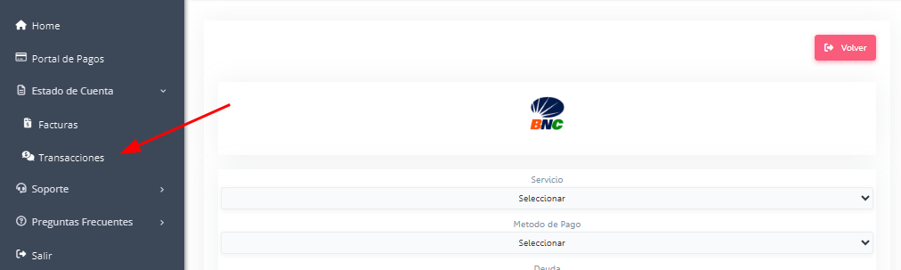 Cabe mencionar la Opción de nuestro portal cliente del lado izquierdo como lo es, Estado de Cuenta, Transacciones.