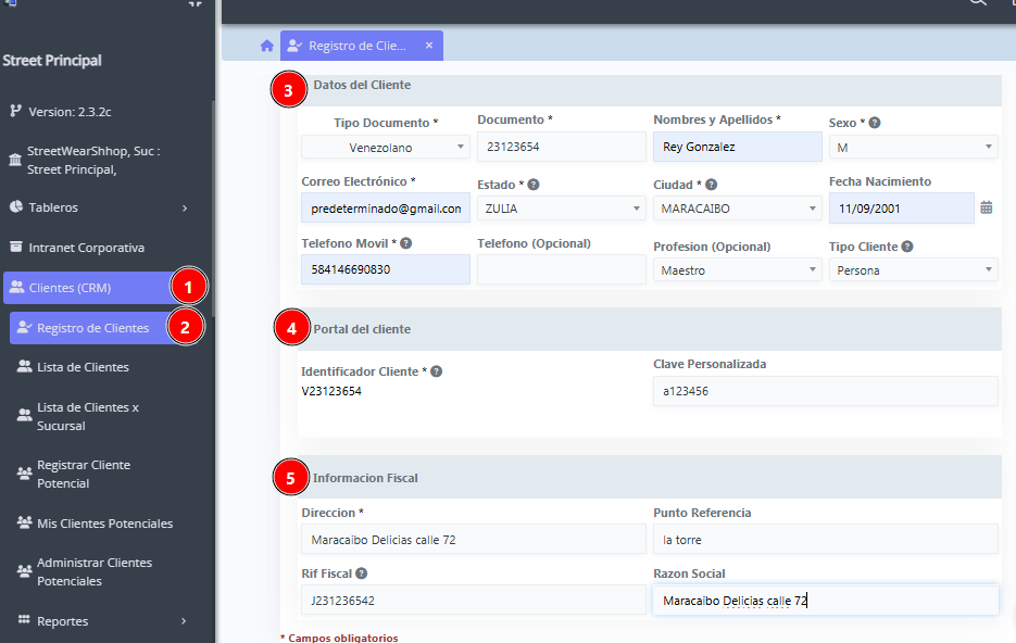 Al Ingresar a nuestro sistema ubicamos el menú en la parte izquierda de nuestra pantalla, hacemos clic en el apartado de Clientes(CRM), luego Registro de Clientes, y empezaremos a rellenar los datos requeridos, como Tipo de Documento, Nro. de Cedula, Nombre Cliente, Mail, Teléfono Móvil, Sexo, Estado, Profesión, Ciudad, Fecha Nacimiento, Tipo Cliente, Clave (esta será usada para el portal cliente).