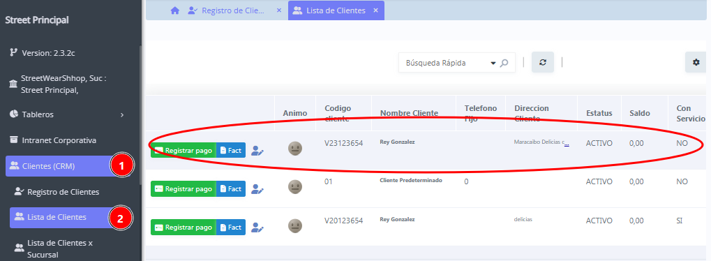 Una vez que terminamos de agregar al cliente, entraremos nuevamente al menú inicial, dándole clic en Clientes y luego Lista de Clientes, y aparecerá ya el cliente registrado.